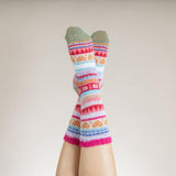 Multi coloured with yellow hearts and dark red cuff, Scandi patterned, ladies wool blend socks