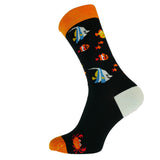 Black Bamboo Socks with bright coloured fish and contrasting heel, toe and cuff.