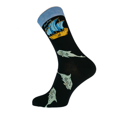 Black Bamboo Socks with sharks and ships and contrasting heel, toe and cuff.