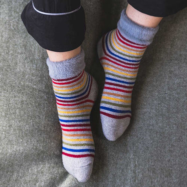 Grey cuff socks with multi coloured stripes and faux fur cuff