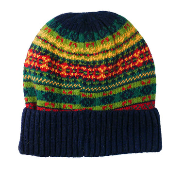 Snuggle in comfort in this dark blue fleece lined hat, featuring a bright Fairisle pattern of yellow, red and green.