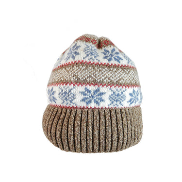 Fawn wool blend hat with blue and white winter pattern. Softest fleece lined to keep you warm whatever the weather!