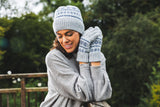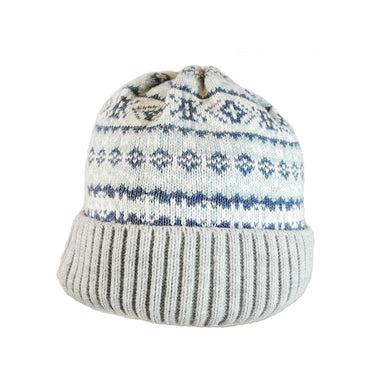 Grey wool blend hat with blue and white winter pattern. Softest fleece lined to keep you warm whatever the weather!