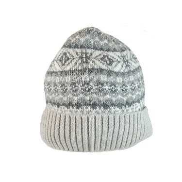 Grey wool blend hat with grey and white winter pattern. Softest fleece lined to keep you warm whatever the weather!