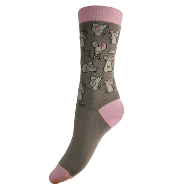 Fawn bamboo socks with grey mice and contrasting pink heel, toe and cuff.