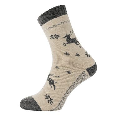 Cream wool blend socks with grey reindeer, trees and snowflake head
