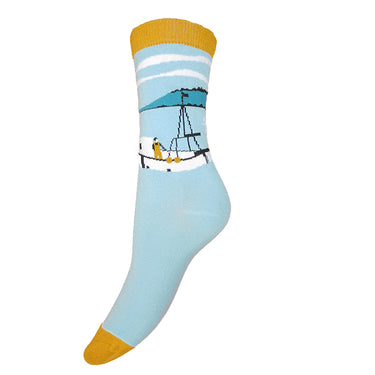 Crafted from 200gsm knit, these wonderful Bamboo socks designed by artist Holly Astle, depict a Fishing vessel in her native Cornwall. They are softer, finer and more comfortable than ever before. Hand linked and reinforced at the heel and toe, Joya Bamboo socks contain more bamboo fiber than most other brands. For lasting wear, simply machine wash at 30 degrees Celsius and do not tumble dry.