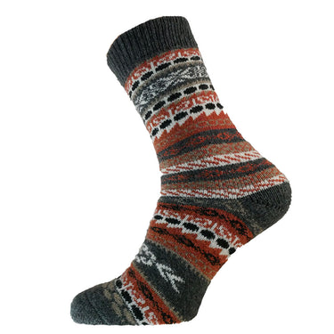 Made with a blend of wool, these soft grey socks have a Scandi pattern in rust, black and cream.