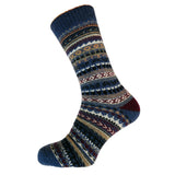 Made with a blend of wool, these soft blue socks have a Scandi pattern in black, white and burgundy.
