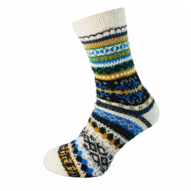 Soft and comfortable, these white, blue and black Nordic patterned socks have a touch of orange and green to brighten them.