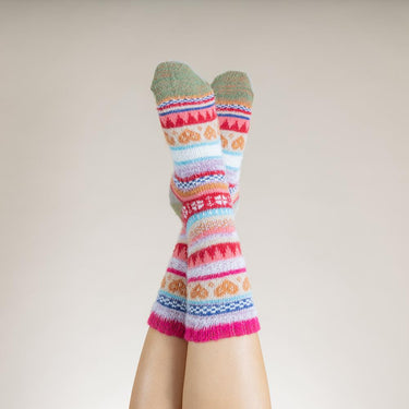 Multi coloured with yellow hearts and dark red cuff, Scandi patterned, ladies wool blend socks