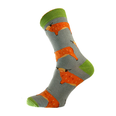 Highland Cow Bamboo socks! Featuring a stylish grey colour with a pop of green on the heel, toe, and cuff, these socks are adorned with a charming Highland Cow motif that will elevate your sock game.